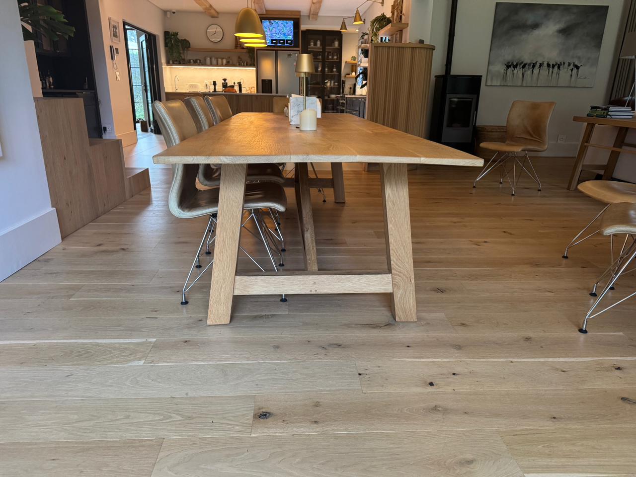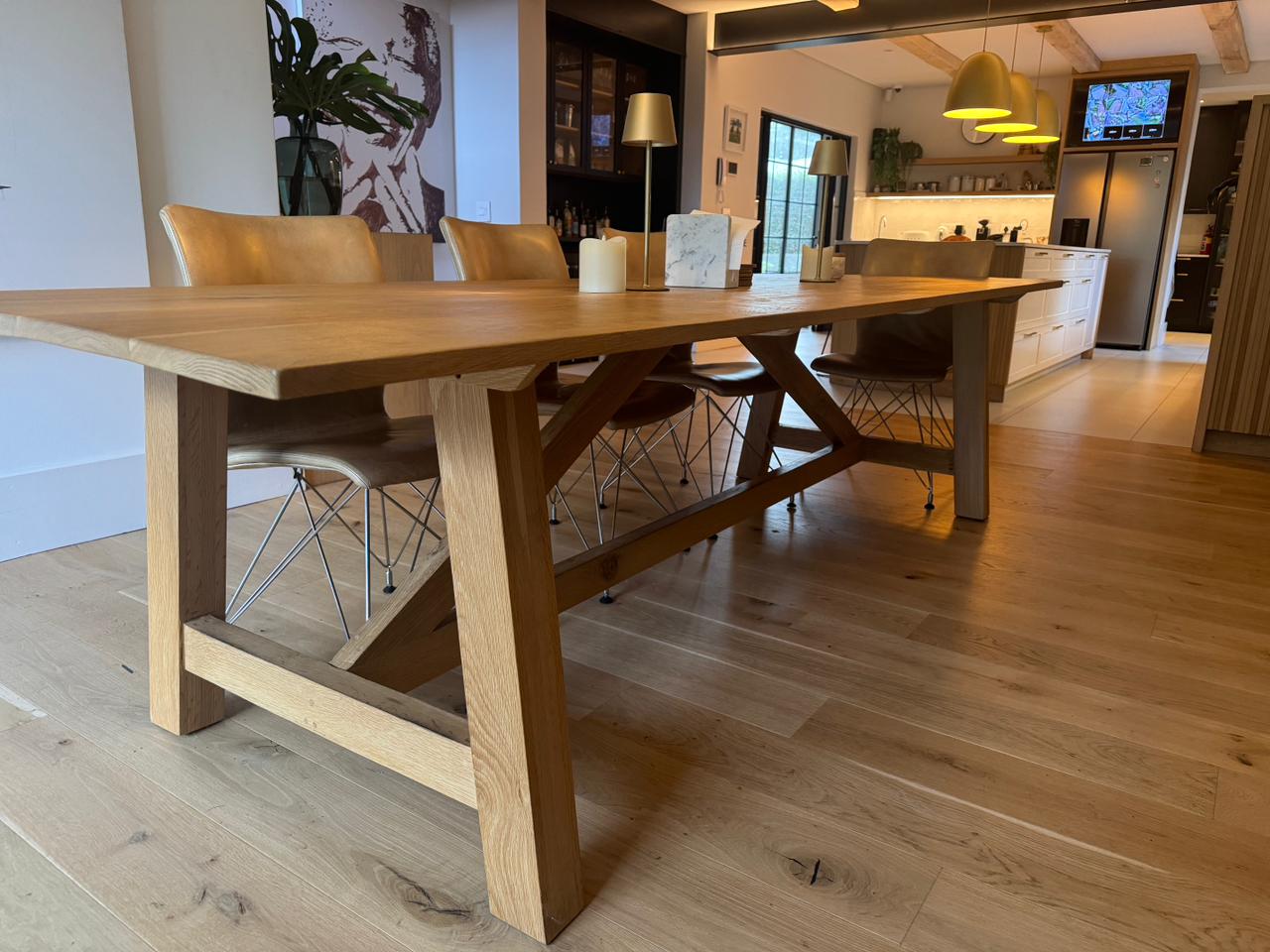Bring timeless character and everyday functionality into your home with this beautifully handcrafted American White Oak farmhouse dining table. Built from premium solid oak, this table showcases a rich natural grain that adds warmth and depth to any dining space, making it a true centrepiece for your home.